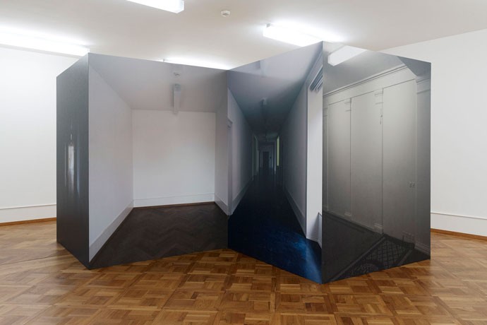 Digital print on non-woven wallpaper, construcktion of wood and MDF, 240 x 720 Installation view, Inversion, PhotoforumPasquArt, Biel/Bienne, 2011